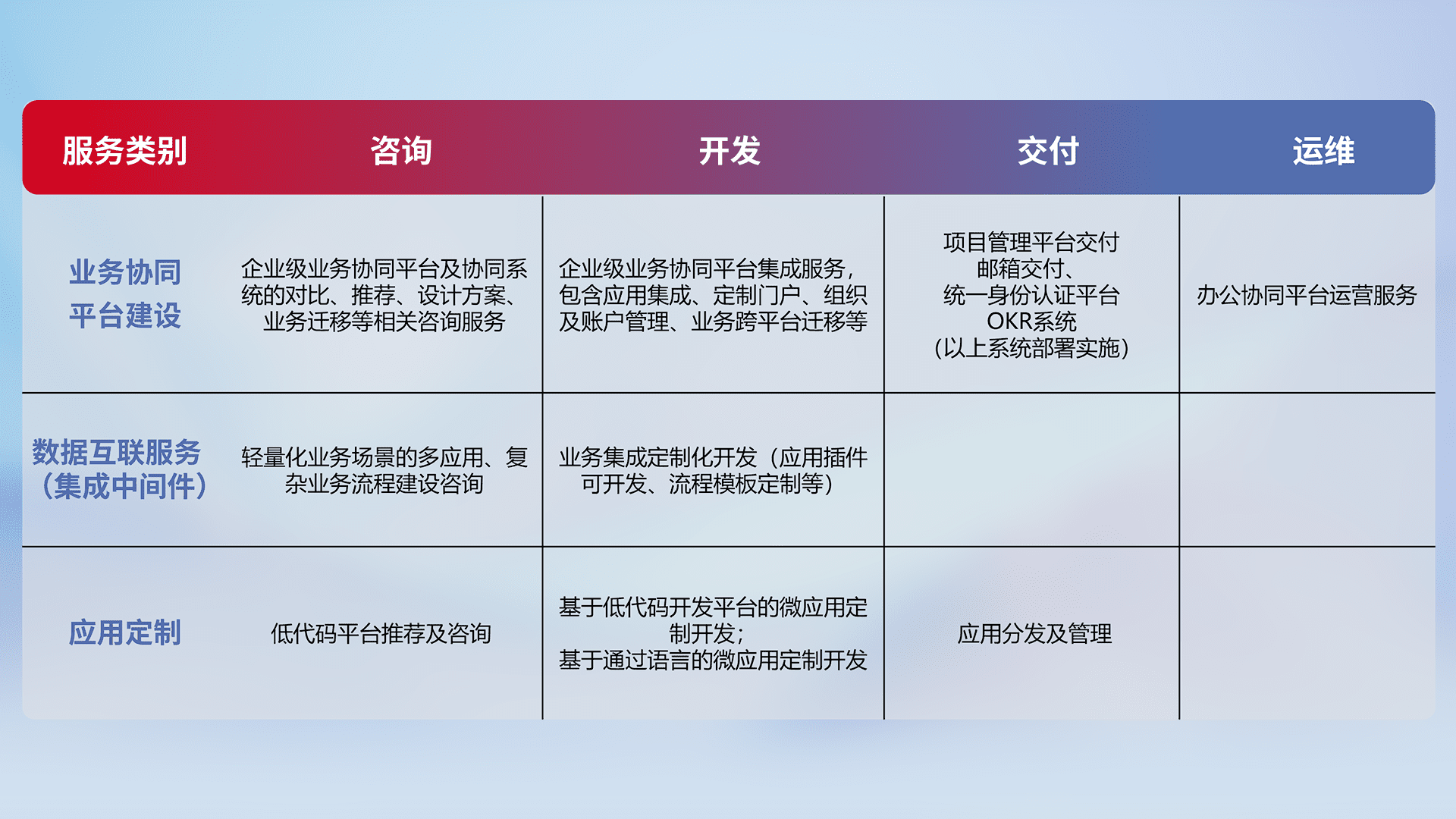 针对钉钉、、、、企微、、、IDaas等平台级产品提供产品的规划、、、、方案、、、交付、、定制化开发等服务,,,,实现如统一协同办公、、、智能客户服务、、、、混合会议管理、、、、智能数据查询、、等业务场景,,实现数字化转型。。。。