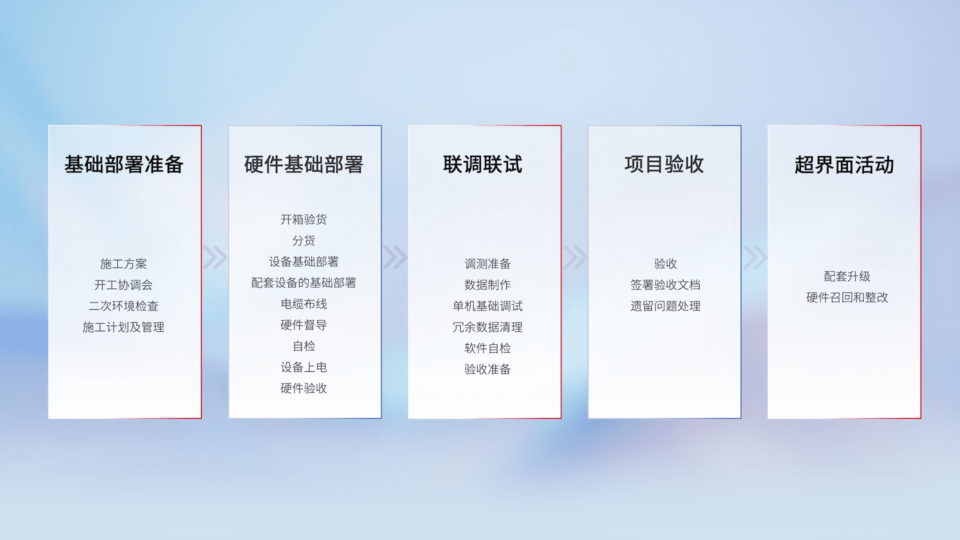 从基础部署准备、、、、硬件基础部署、、、联调联试、、、、项目验收、、、、越界面活动的全过程可追溯,,保证施工质量和进度。。